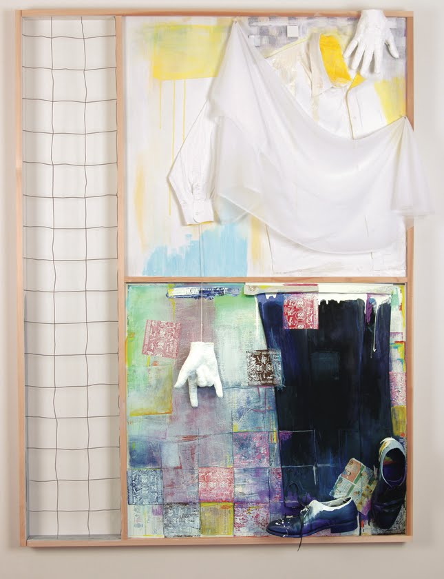 This painting/combine shows the reason for Christ's death on the cross. His right hand shows the universal sign language "I Love You." The small left hand represents child-like faith. Each hand has white interior representing purity. The right arm with the rope tells us to hang on and follow him. Behind the rope are words of the Lord's supper that Jesus spoke. You can see the words in red and also gold when viewed at different angles and lighting. The left arm shows partial scripture involving Pontius Pilate. The head of Christ shows blood-soaked hair, representing His blood flowing for many. The body shows brokeness, with the Cubist art influence.